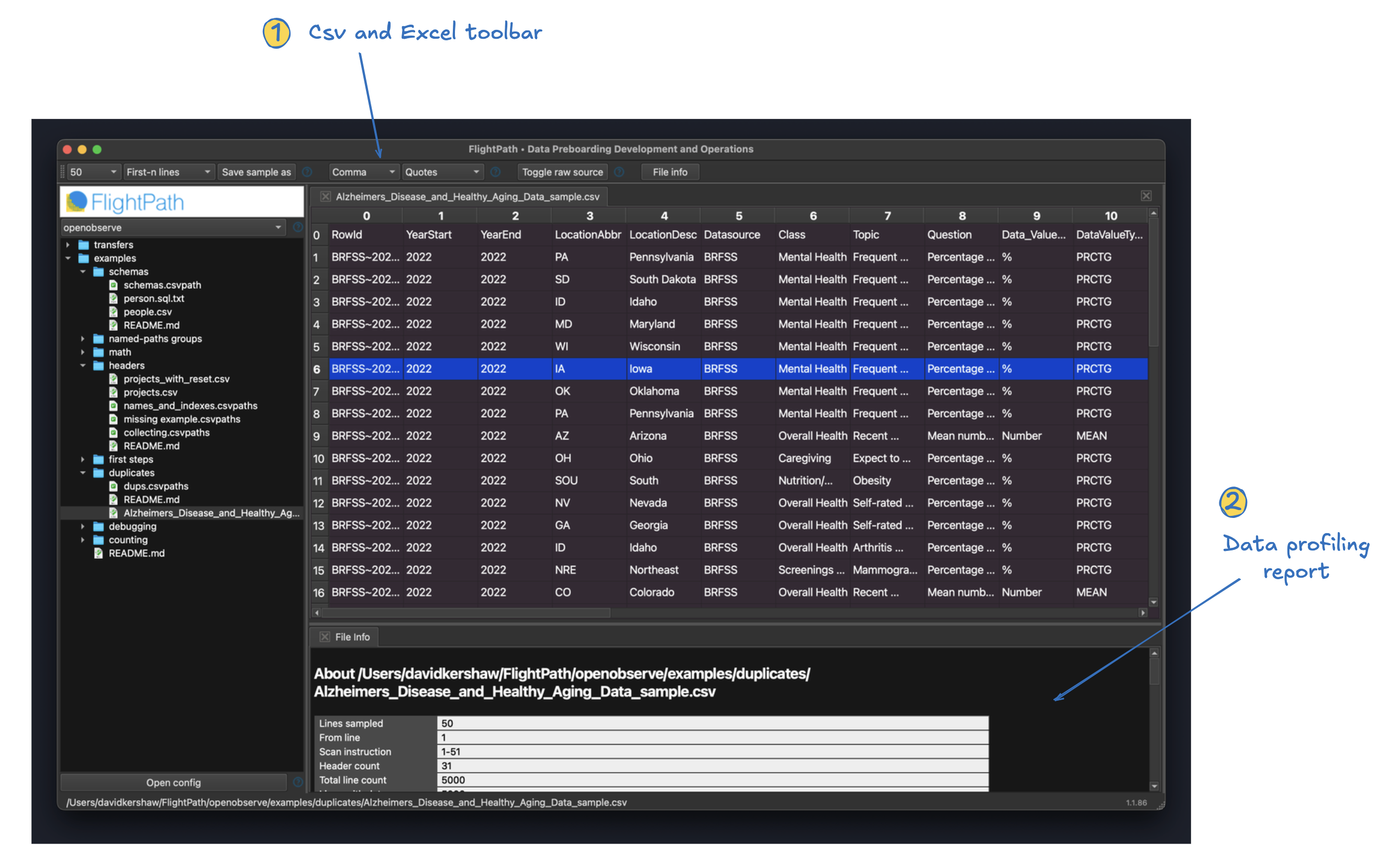 Please remember, FlightPath Data is not a CSV editor. It is an environment for developing automated data preboarding pipelines using CsvPath Validation Language. Why does it not offer CSV editing? One reason is that data preboarding involves Excel and other files that have very different requirements. Another reason is that there are many capable tools for editing text files and CSV files available. We assume the world doesn’t need another one. But if there is demand, FlightPath Data may expand its capabilities in that direction in the future.