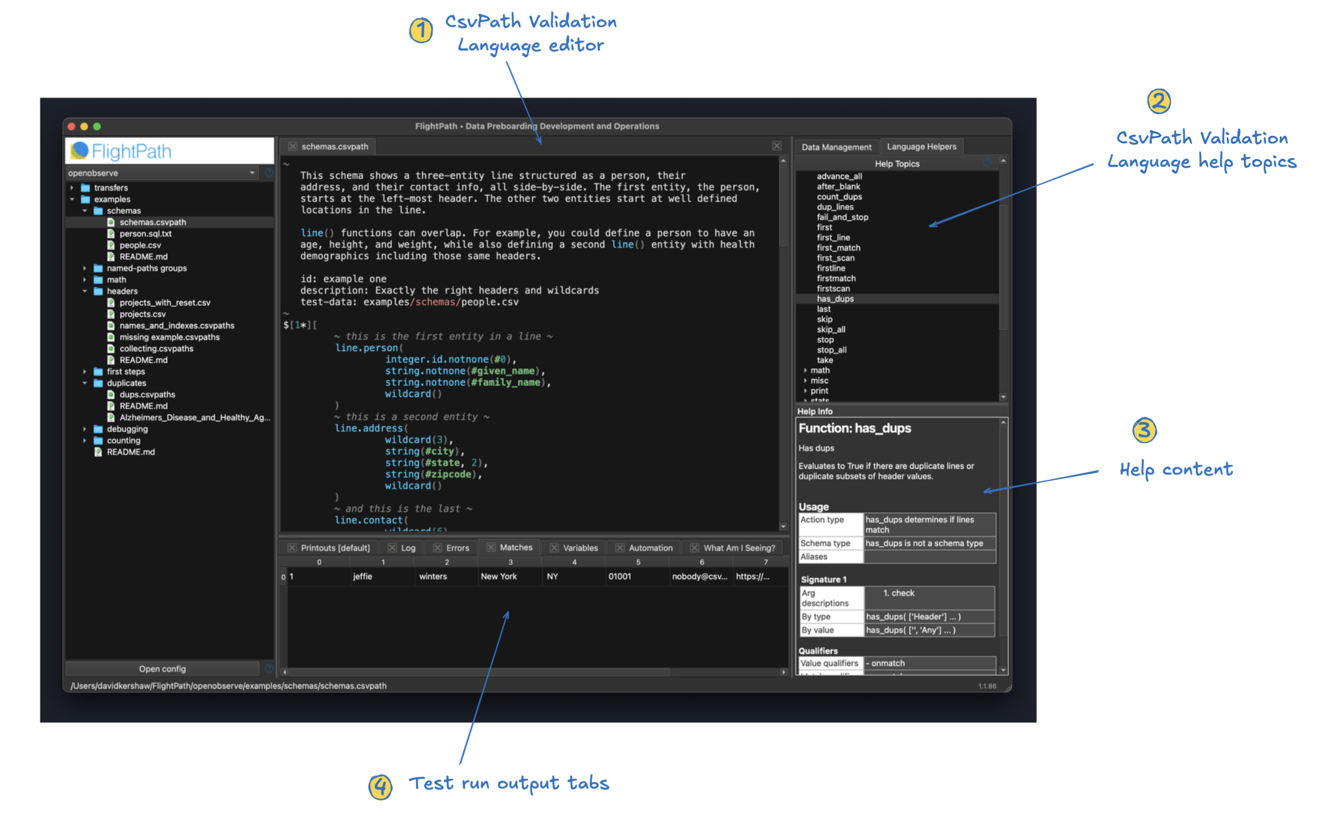 - Validation Language editor. FlightPath Data is primarily about two things: validation and upgrading and data preboarding pipelines. The csvpath editor helps you create validation and upgrading scripts quickly. It has CsvPath Validation Language syntax highlighting, context menu input help, and the ability to do test runs from the context menu or using control-R.