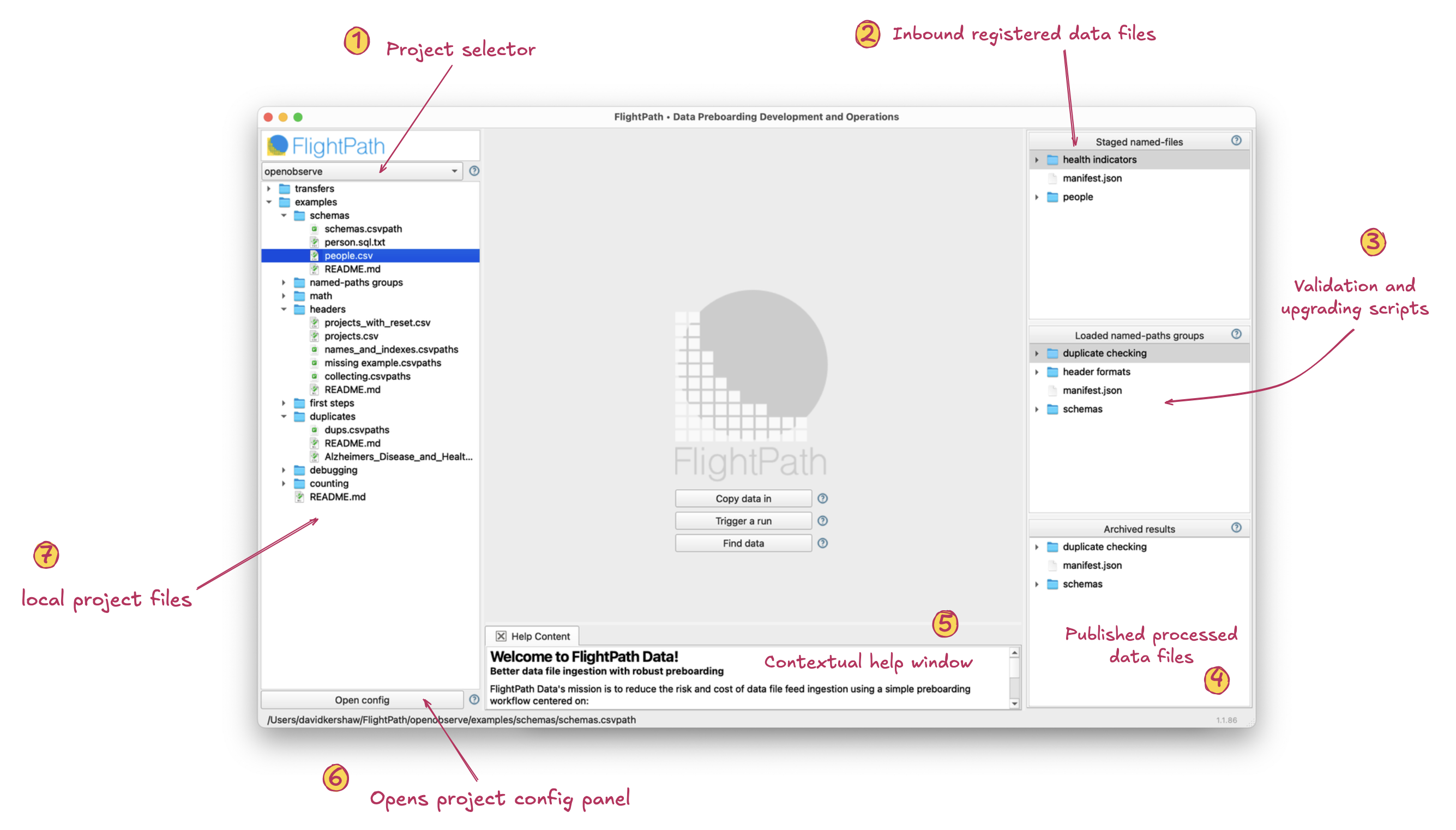 icon click to open this help and feedback window and see explanations that are specifically about what you are currently trying to do. - Open project config. This button opens the project config. FlightPath Data manages a config file for every project that locates the registered files, environment variables, etc. There are essentially no config setting for FlightPath Data itself.