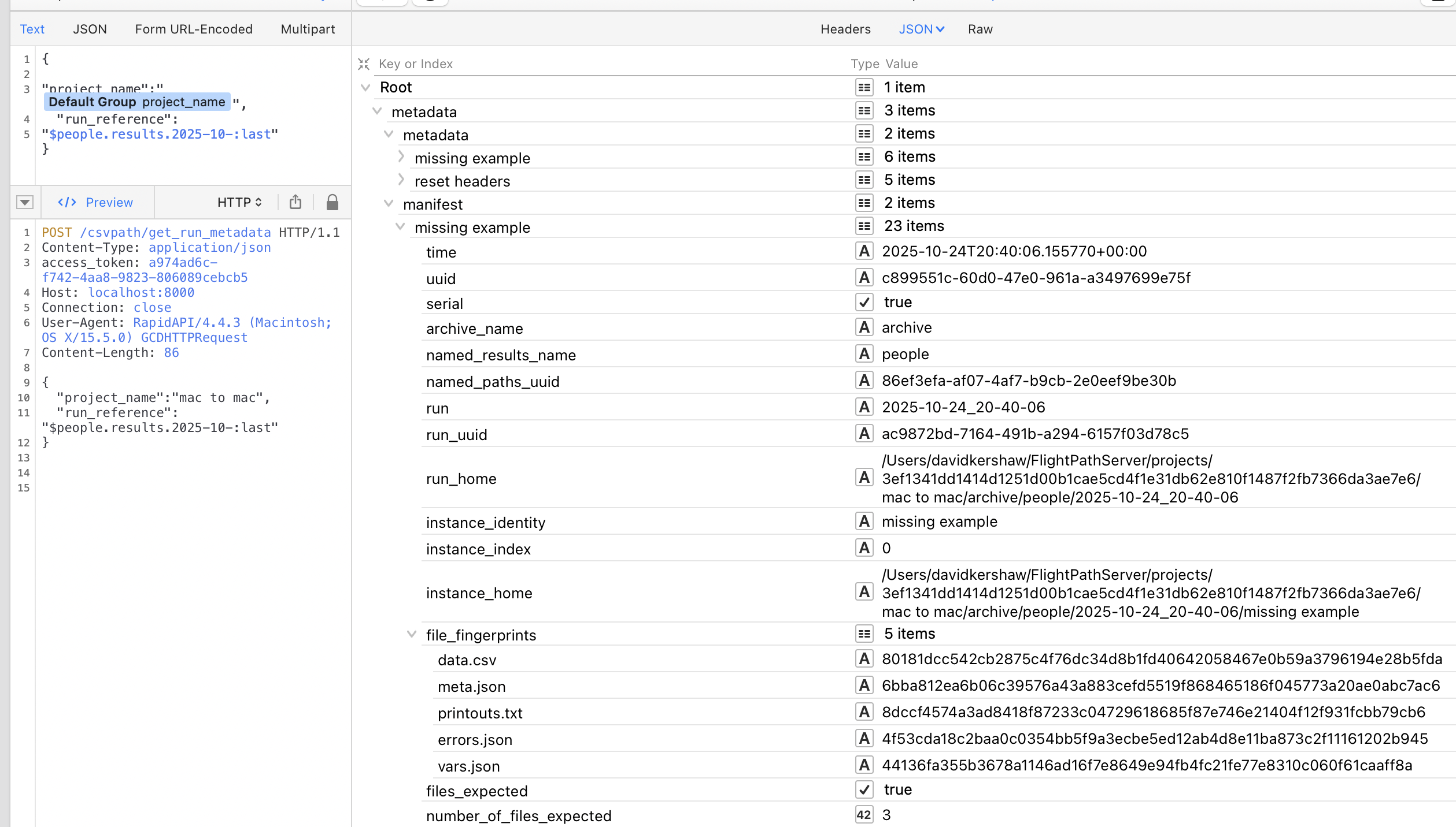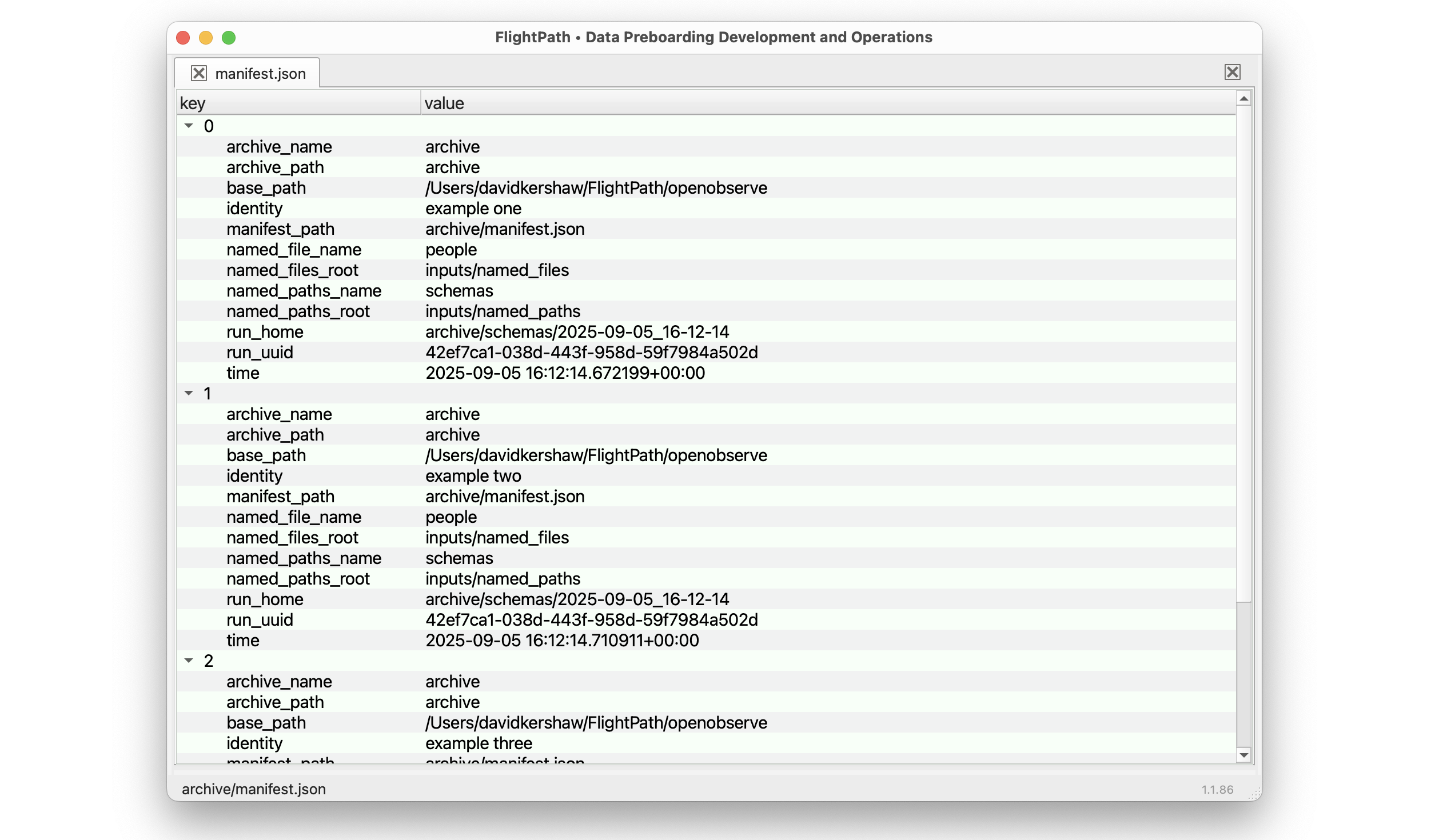 When you have a run dir you have all the assets that were created in the run. That includes matching data files, metadata, errors, variables, and printouts. Each run has a manifest file that captures information about the run as a unit. The fields give more detailed information about the csvpaths and source data file, including fingerprints and UUIDs, so you can refer back to the metadata captured about those assets themselves. You also find success and completion indicators, such as validity, error counts, result files generated, etc.